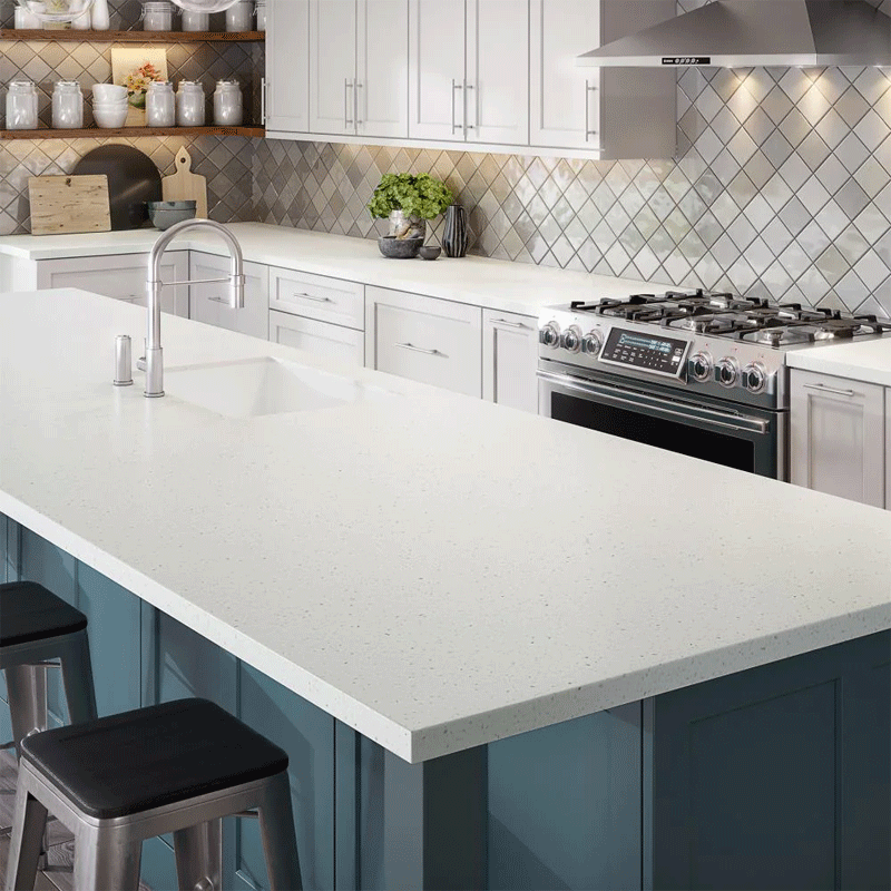 Ở khu vực vách ngăn giữa của 2 tủ bếp trên và dưới bạn nên ưu tiên chất liệu kính hoặc đá để dễ vệ sinh mà sang trọng. Trong khi đó những mặt tủ bếp có thể ốp đá marble, đá granite, đá vicostone.. vừa đảm bảo an toàn, sang vừa dễ dàng vệ sinh. Tùy thuộc vào ngân sách gia đình để chọn chất liệu phù hợp.