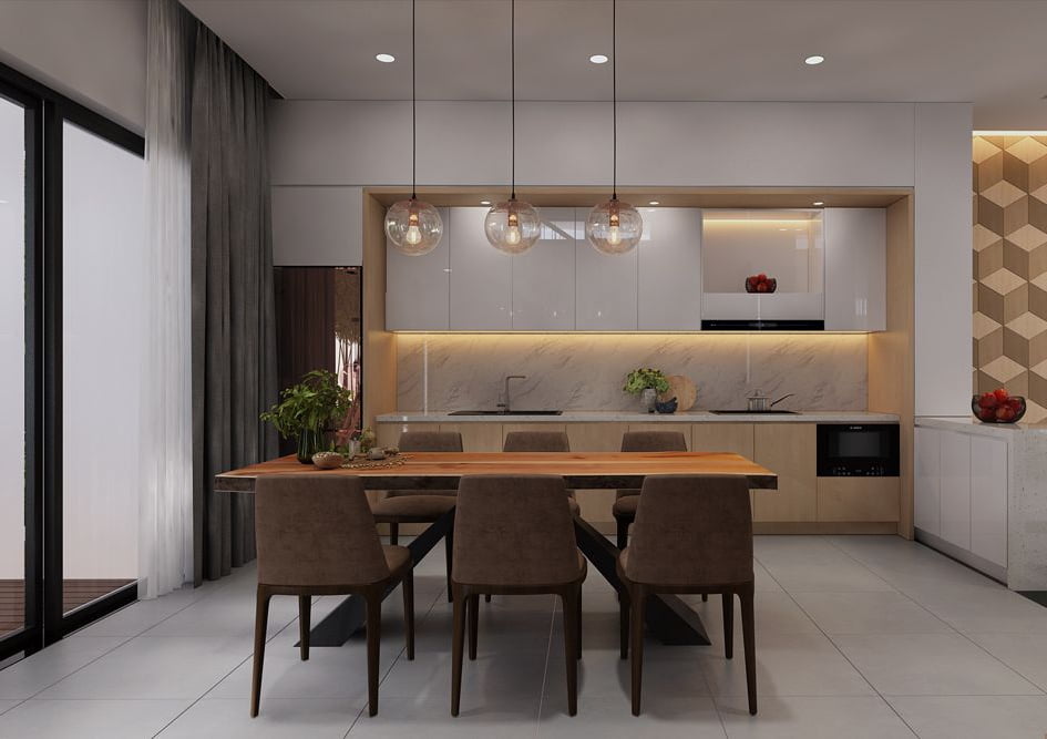 Vì tính an toàn, phong thủy và thẩm mỹ nên nhà bếp cần đảm bảo sự thông thoáng, ngoài việc sắp xếp nội thất gọn gàng thì nên ưu tiên thiết kế nhà bếp với không gian mở kết nối với phòng ăn để tạo ra một không gian sinh hoạt thuận tiện.
