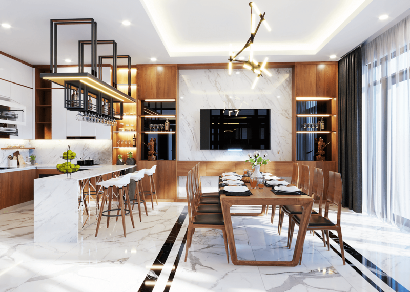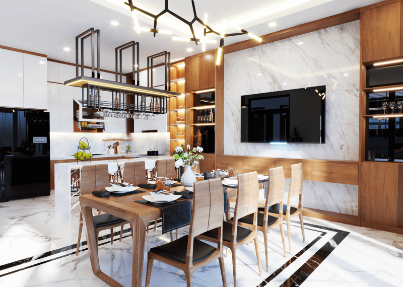 Phòng ăn với bộ bàn ghế gỗ sang trọng, trần được trang trí thêm đèn cùng với kệ tủ tivi mang đến những giây phút ăn uống đầy thư giãn. Trong khi đó tủ bếp với hình chữ U, thiết kế thông minh với những kệ tủ, thiết kế kệ ly… mang đến một không gian bếp tiện nghi, một nơi nấu nướng, thưởng thức ẩm thực tuyệt vời