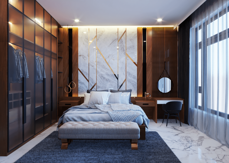 Chất liệu bằng gỗ tiếp tục được sử dụng trong thiết kế nội thất phòng ngủ mang đến sự ấm áp cho căn phòng. Nội thất được sắp xếp gọn gàng đặc biệt tủ quần áo làm bằng kính, thiết kế sát trần tăng không gian lưu trữ, tối ưu diện tích giúp căn phòng thêm sang.