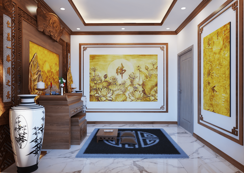 Là căn phòng quan trọng, ngoài yếu tố thẩm mỹ thì phong thủy, văn hóa hay nét đẹp truyền thống luôn được cân nhắc kỹ lưỡng. Kiến trúc sư đã tỉ mỉ trong từng chi tiết, hoa văn trang trí, nội thất cũng như ánh sáng để phòng thờ biệt thự 3 tầng 5 phòng mang tính thẩm mỹ, ấm cúng và trang nghiêm.