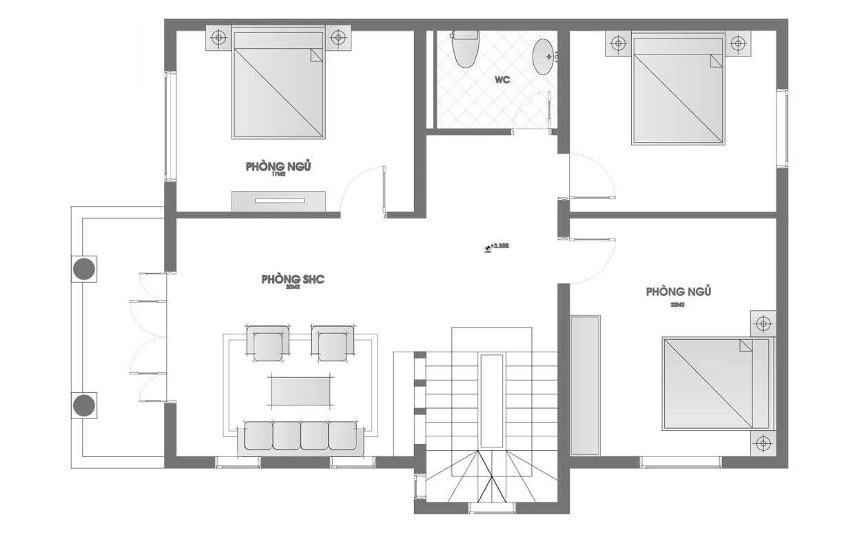 Mặt bằng lầu 2 biệt thự 3 tầng 5 phòng ngủ