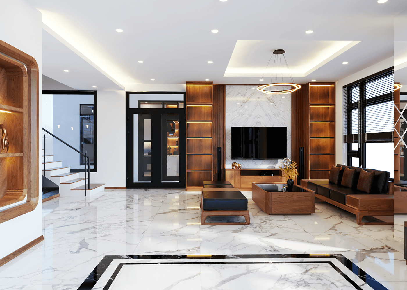 Phòng khách với bộ bàn ghế sofa bằng gỗ óc chó, nệm ghế cao cấp, kệ tủ tivi gắn liền với đèn led giúp căn phòng trở nên lung linh hơn.