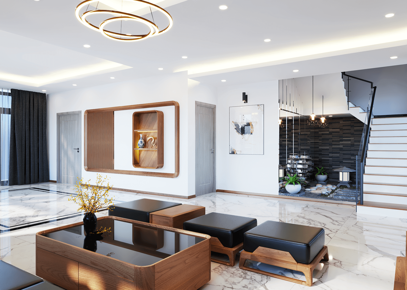 Tối giản về nội thất cũng như phụ kiện trang trí nhưng không vì thế mà phòng khách biệt thự 3 tầng trở nên đơn điệu vì kiến trúc sư đã nhấn nhá những chiếc kệ cũng như trang trí khu vực cầu thang với những tiểu cảnh thiên nhiên, bức tranh cho không gian trở nên sinh động hơn rất nhiều.