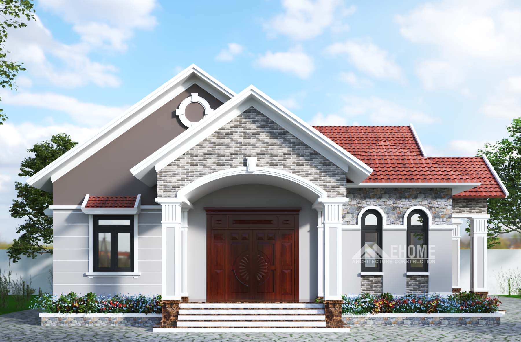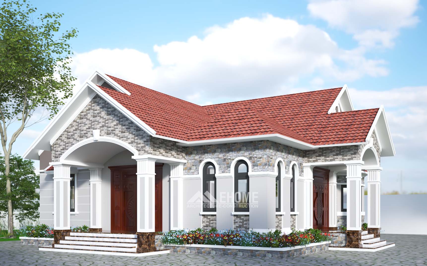 Biệt thự 1 tầng mái thái với 2 mặt tiền kết hợp Mái đón Chữ A, Cột vuông. góc giữa là mái Chớp Vuông cũng là phòng Thờ được đặc Trang trọng trước mặt tiền nhà.