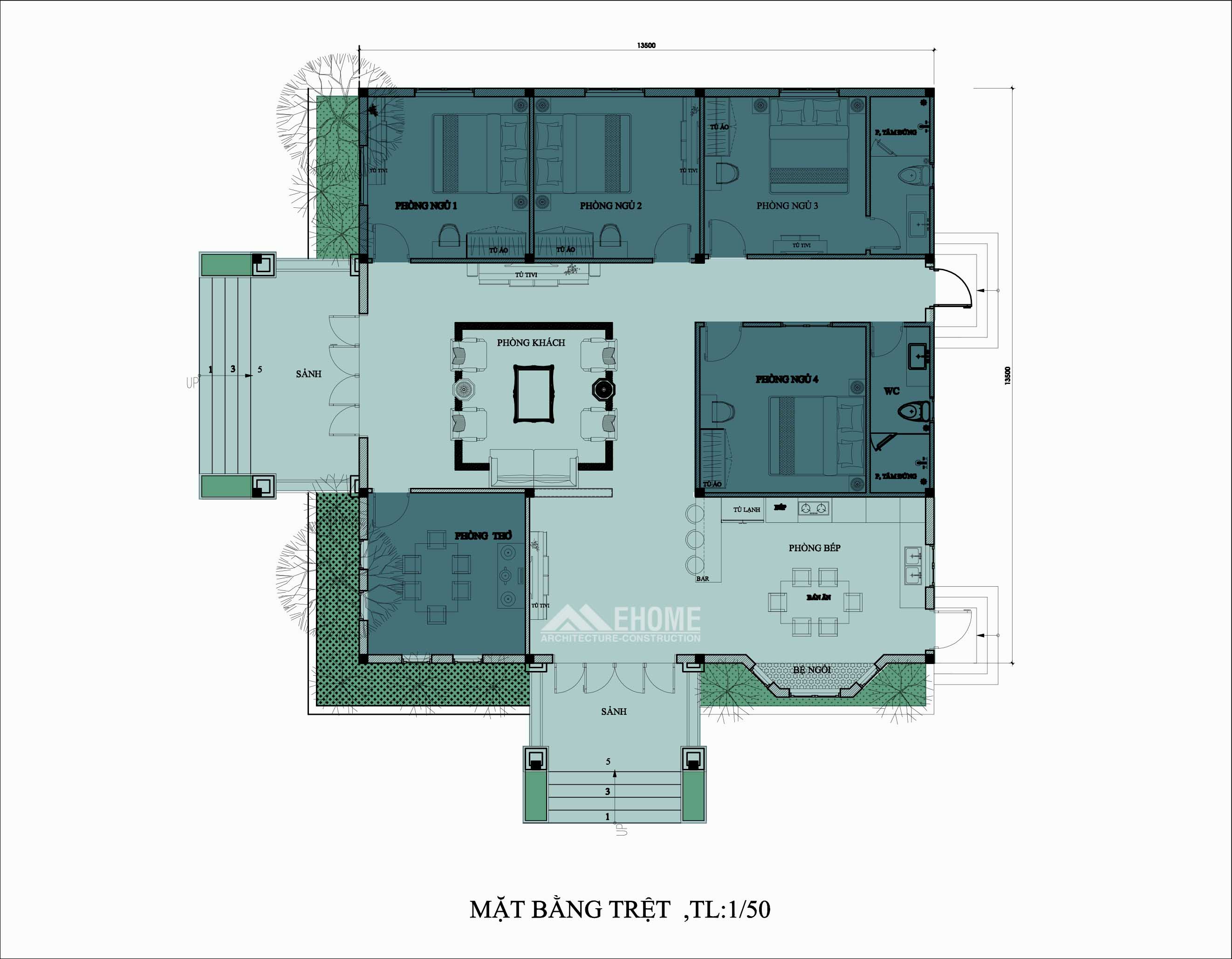 - Phần Tĩnh (gồm 4 phòng ngủ) nằm phần sau của Ngôi nhà, là không gian thư giãn, yên tĩnh-> thích hợp nghỉ ngơi.