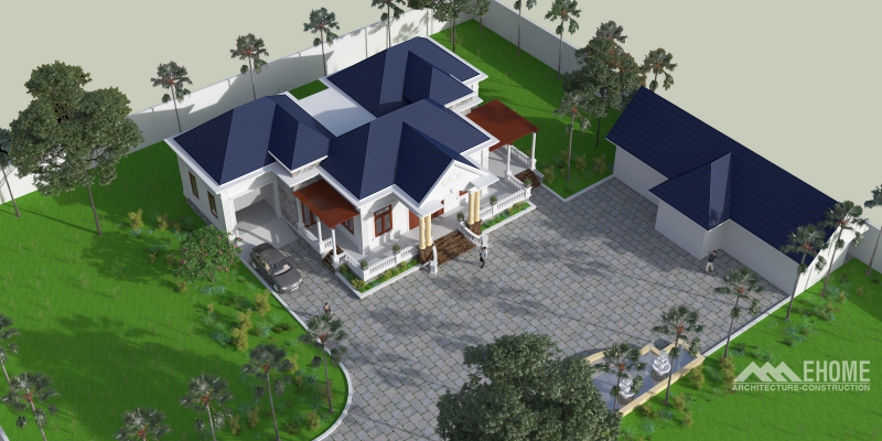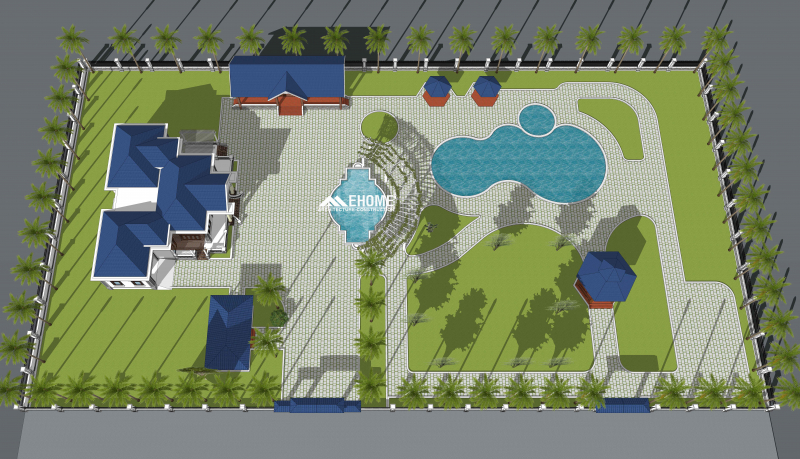 Qui mô: Biệt Thự Nhà Vườn 1 tầng ,3 phòng ngủ, hồ bơi, nhà khách