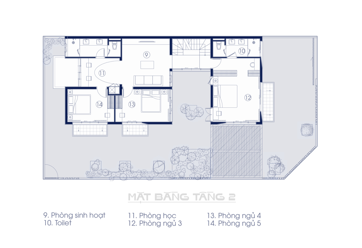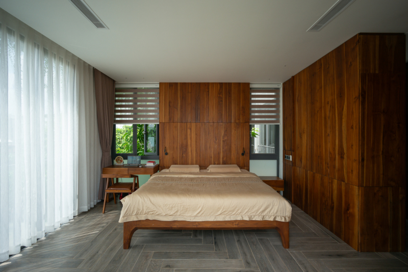 Tầng 2 dành riêng cho không gian nghỉ ngơi để đảm bảo sự yên tĩnh và tất nhiên ngoài phòng ngủ còn có phòng sinh hoạt chung để tạo sự kết nối cho các thành viên trong gia đình. Mỗi phòng ngủ được bố trí nội thất, thiết kế cửa phù hợp để thiên nhiên luôn hiện hữu.