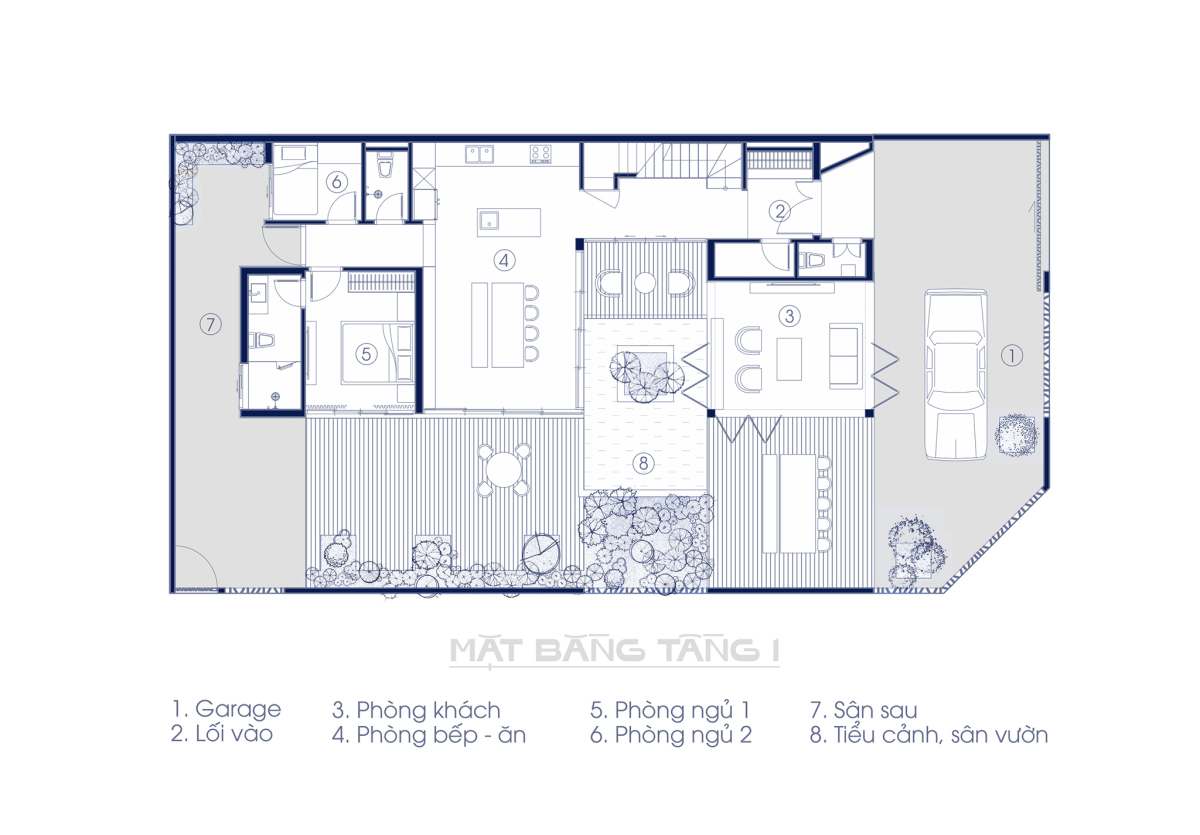 Mặt bằng tầng một biệt thự 3 tầng không gian mở