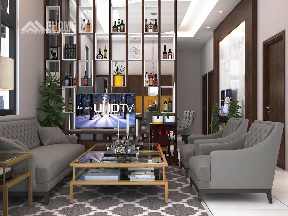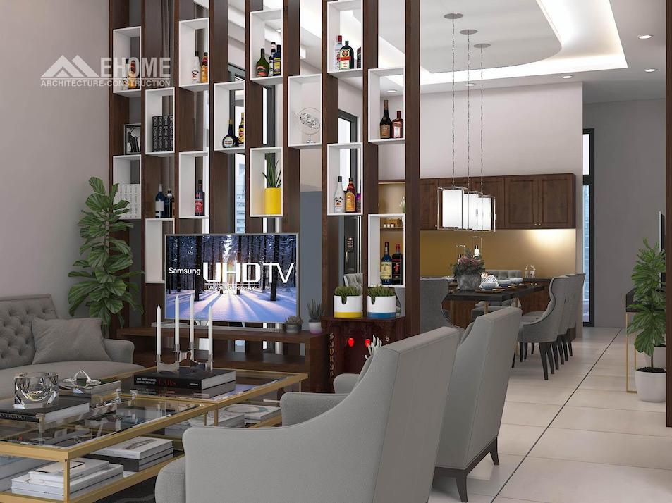 Nội thất phòng khách biệt thự hiện đại là vách ngăn giữa phòng khách và phòng ăn là tủ rượu có song gỗ được ngăn chia bằng khối hình chữ nhật màu trắng trang trí.