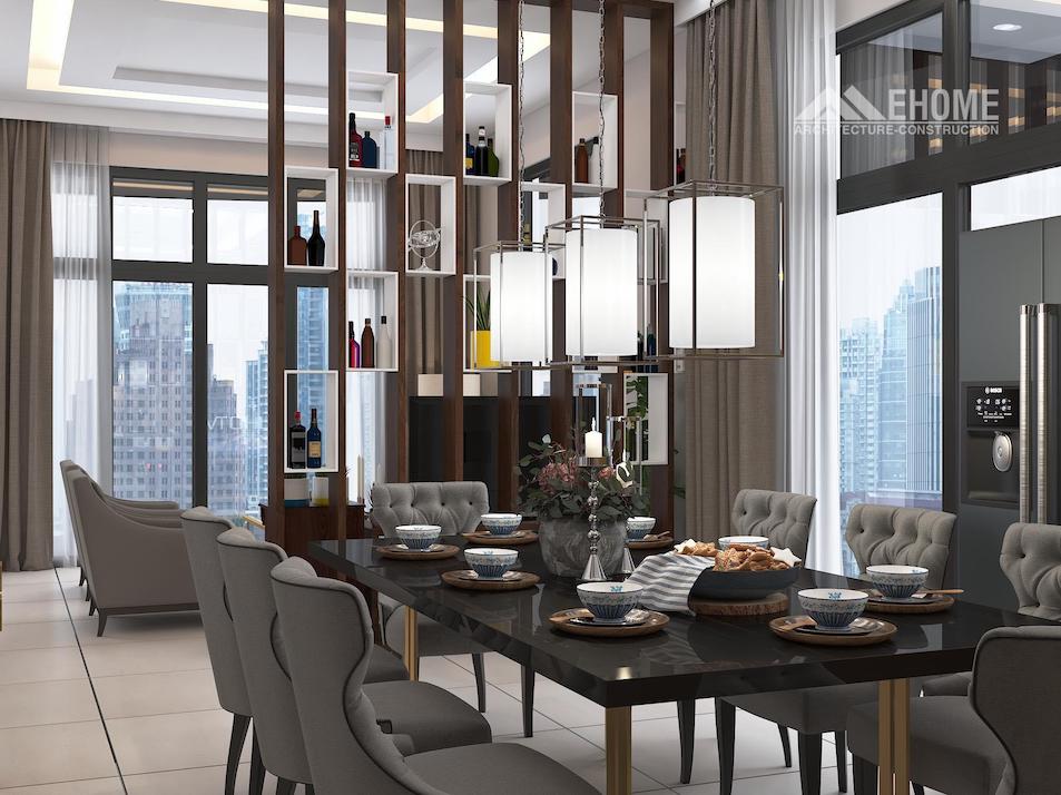 Phòng ăn được thiết kế theo phong cách hiện đại, Ghế da, bàn đá đen có chân bằng Inox vàng.