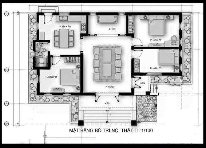 Bản vẽ nhà cấp 4 3 phòng ngủ 1 phòng thờ