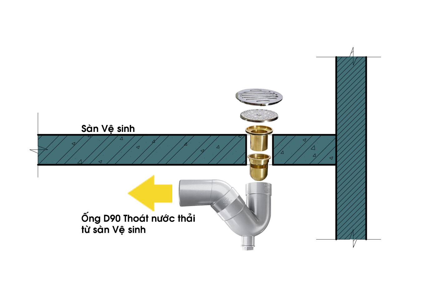 2- Ống thoát sàn D90mm làm 2 Co Lơi D90 ngiêng 1 góc 45* để giử nước ngăn mùi hôi.