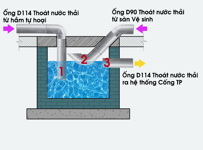• A Dinh: Nhà Thầu của Anh làm Hầm tự hoại 3 ngăn, 1 hố ga trong nhà gom hết ống thoát sàn, bồn rửa, Hầm tự hoại và đi ống D114mm ra hố Ga ngoài sân, đi vào ống thoát thành phố. Hố ga được lăm le đá 4x6 và xây gạch Ống tô chống thấm bằng hồ dầu Xi măng.
