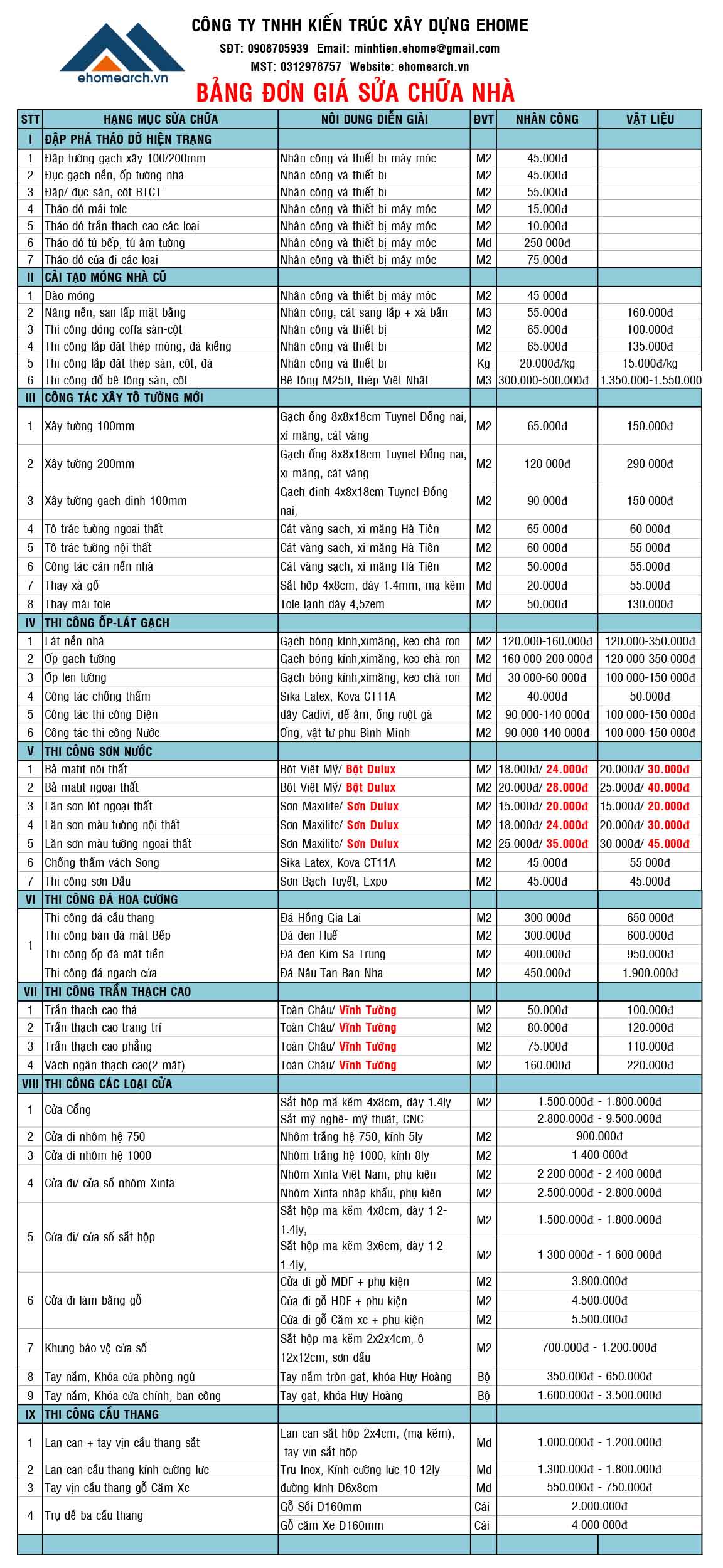 Công ty EHOME xin gửi bảng báo giá sửa nhà chi tiết cụ thể để quý khách hàng tham khảo. Chúng tôi cam kết mang đến giá tốt nhất với chất lượng đảm bảo
