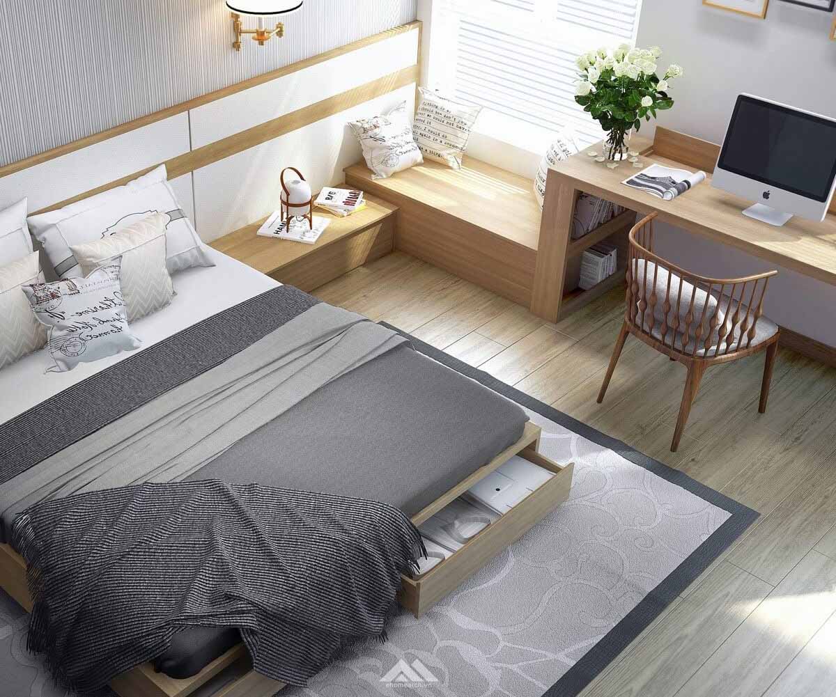 Để phòng ngủ nhỏ đẹp bạn có thể ưu tiên cho những giường ngủ kết hợp với tủ quần áo để tối ưu diện tích hoặc giường ngủ thông minh có ngăn kéo để lưu trữ đồ vật, bàn trang điểm kết hợp với bàn làm việc…