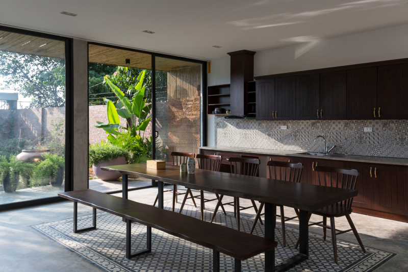 Khu vực bếp và phòng ăn được bố trí ở gần cửa bên hông để giúp cho việc quá trình lưu thông không khí được tốt hơn, hạn chế được tiếng ồn khi nấu nướng mà phòng khách đang có khách.