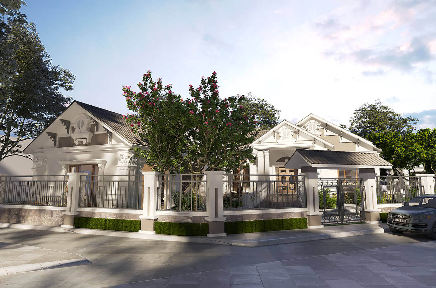 Chúng ta thường thấy những mẫu biệt thự vườn, nhà vườn 1 tầng 5 phòng ngủ hiện đại, tuy nhiên ngoài phòng cách đó thì biệt thự 1 tầng 5 phòng ngủ phong cách tân cổ điển vẫn được nhiều gia chủ yêu thích. Với sự lược bỏ những hoa văn nặng nề thay vào đó là những đường gờ, phào chỉ nhẹ làm điểm nhấn giúp biệt thự trở nên tinh tế hơn.