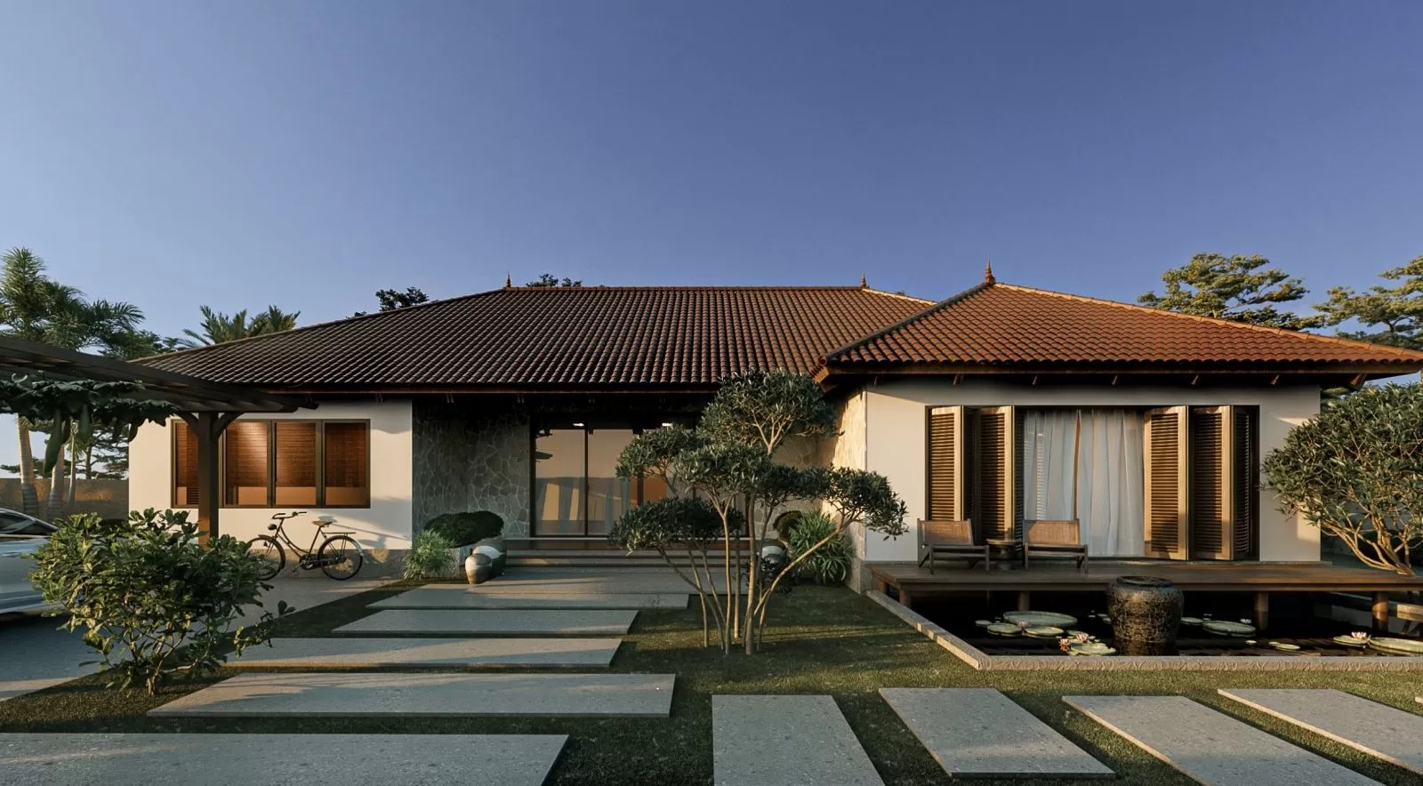 Biệt thự vườn 1 tầng 5 phòng ngủ mái Nhật đẹp, sang trọng. Ngôi nhà với phần mái đua ra rộng phía trước tránh tình trạng hắt nắng mưa vào bên trong. Bên cạnh đó chất liệu kính với thiết kế cao sát trần mở ra tầm view rộng mở. Thiết kế hài hòa từ màu sắc, đến kiến trúc, sân vườn… đã mang đến một biệt thự tuyệt đẹp.