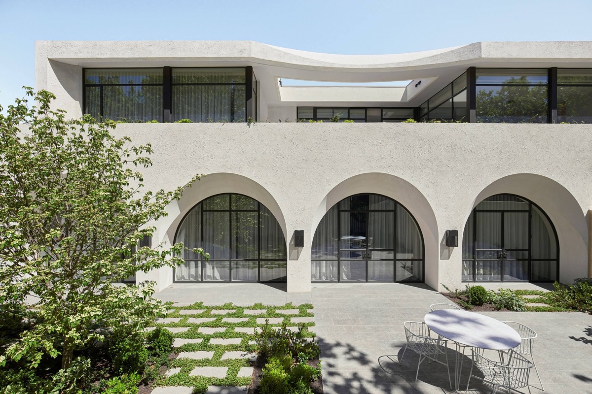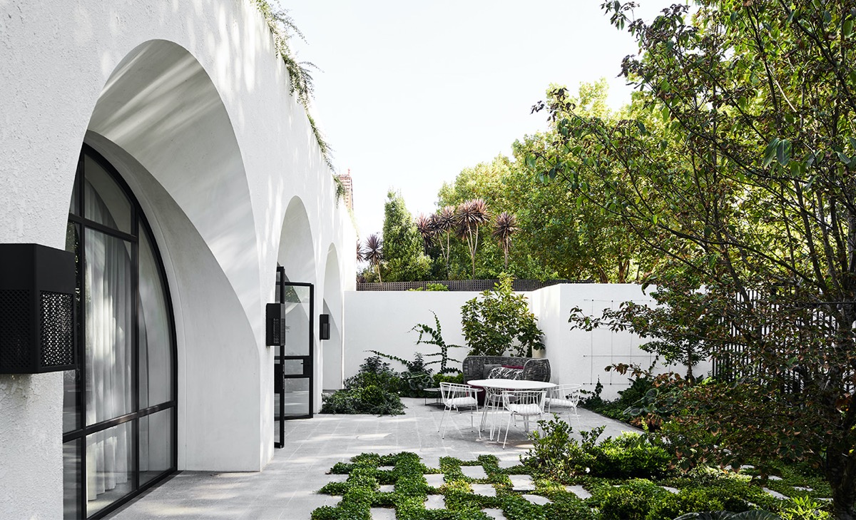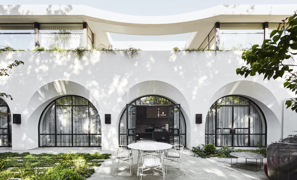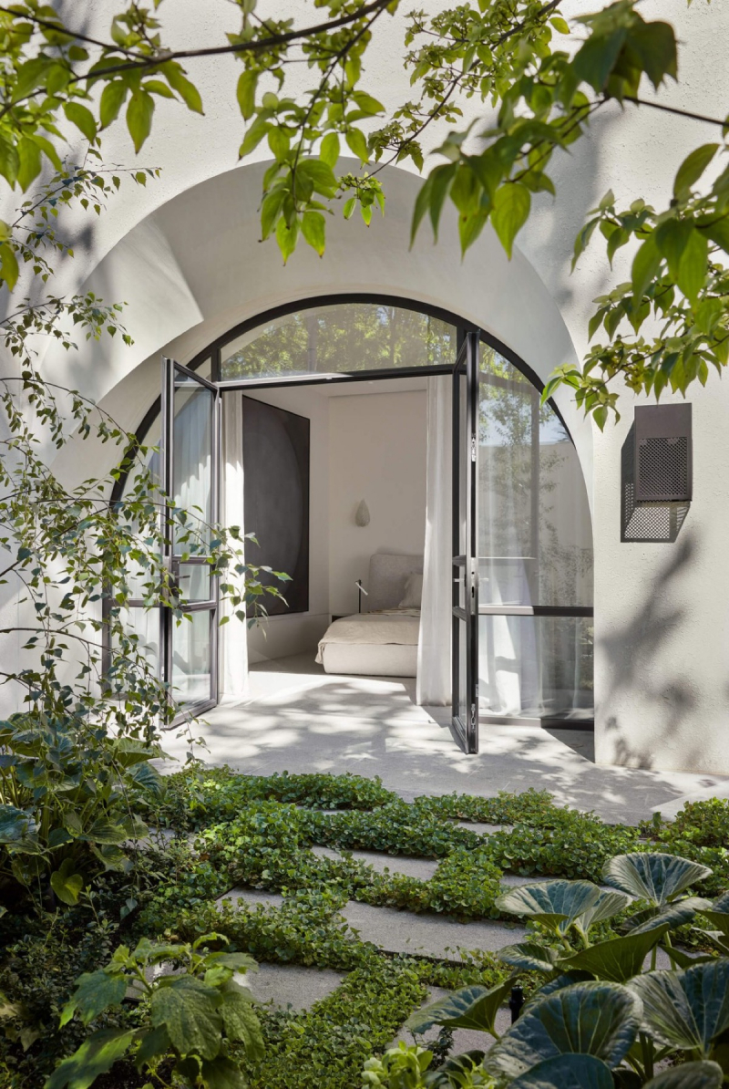 Bức tường đơn sắc nhẹ nhàng làm nổi bật những điểm nhấn vòm cong đặc biệt thiên nhiên xanh hiện hữu xung quanh .