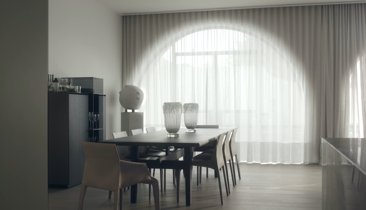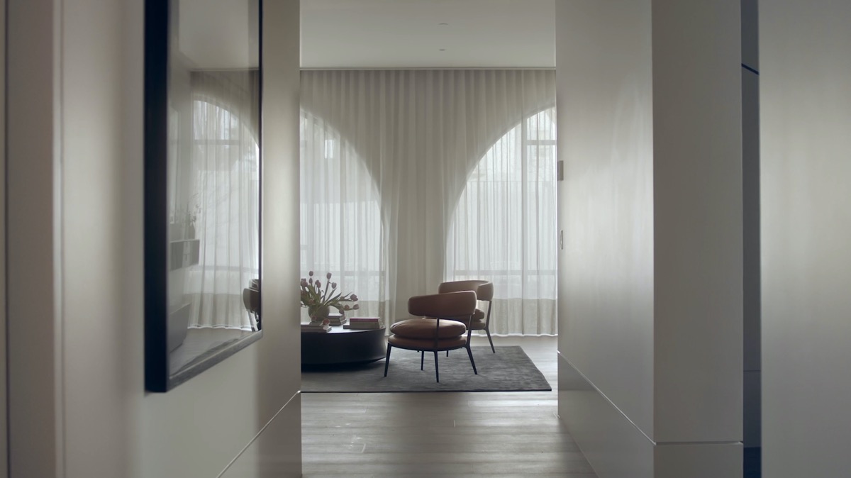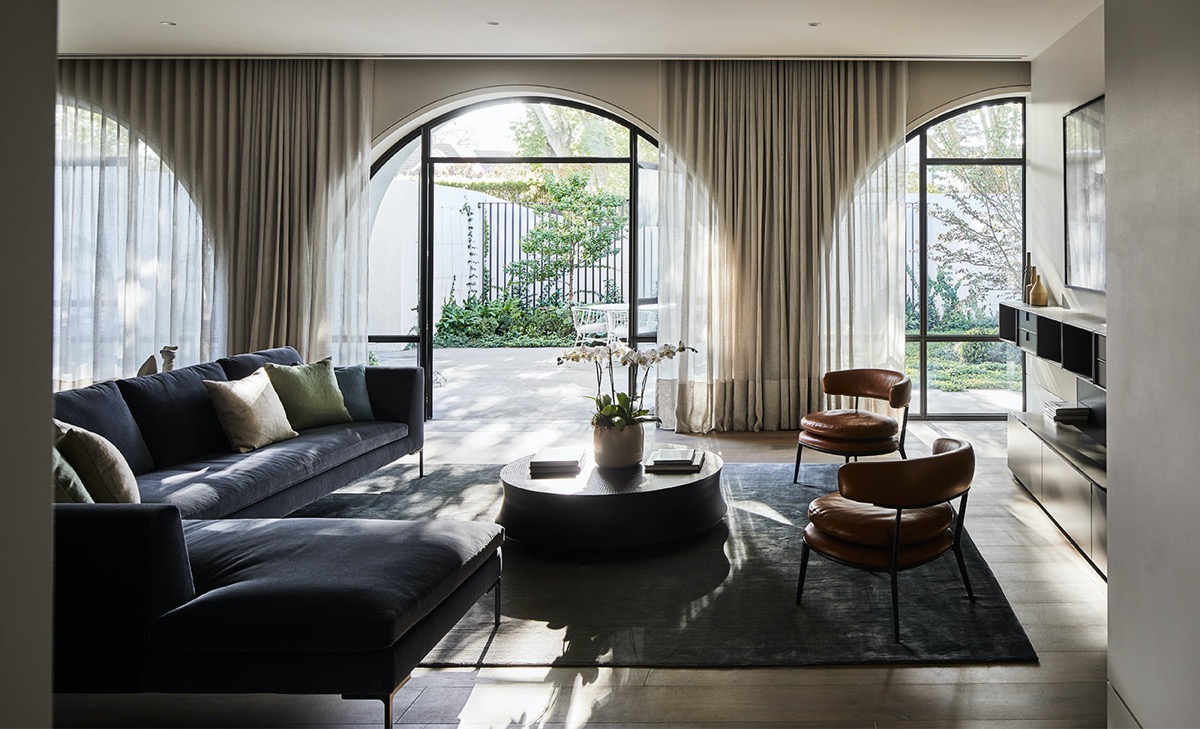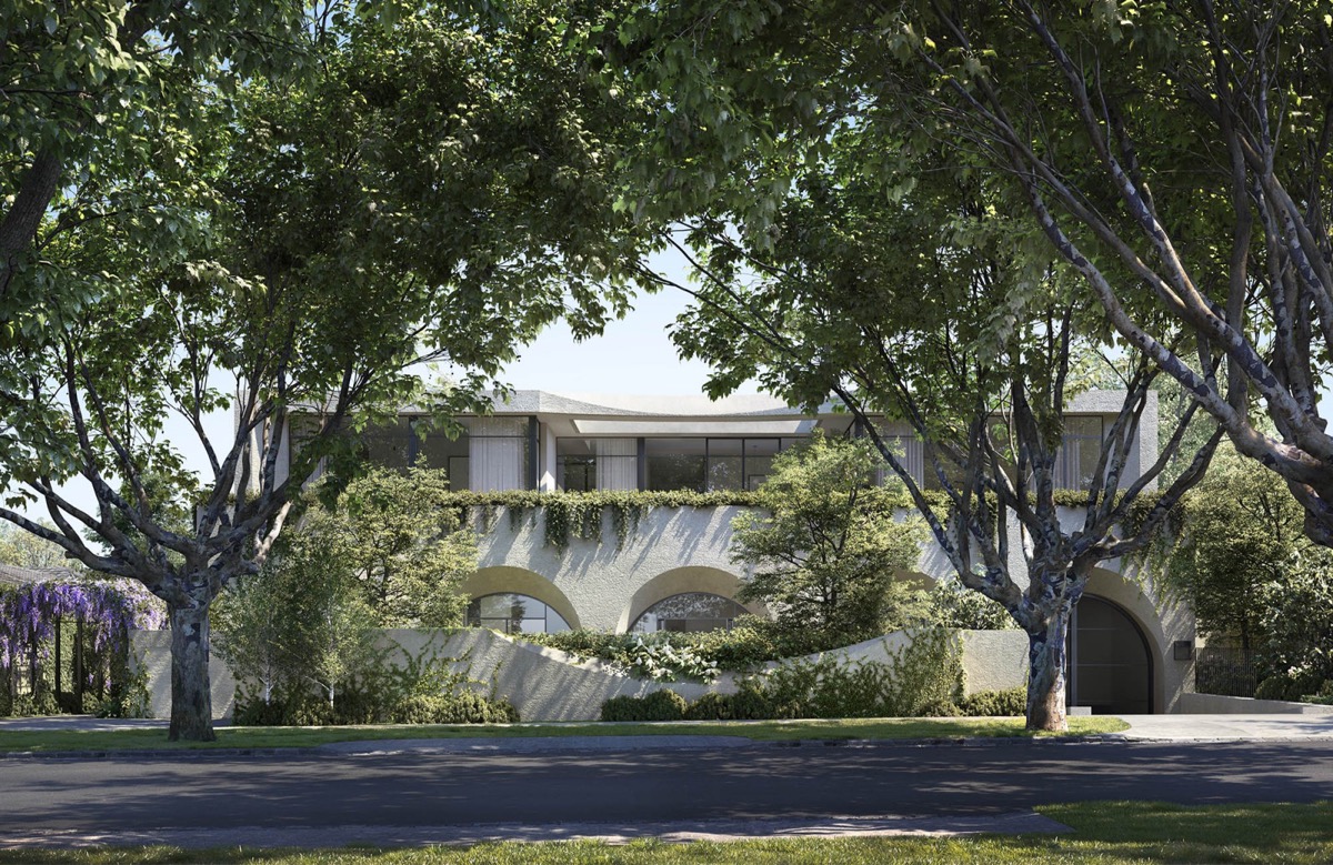 Bức tường đơn sắc nhẹ nhàng làm nổi bật những điểm nhấn vòm cong đặc biệt thiên nhiên xanh hiện hữu xung quanh .