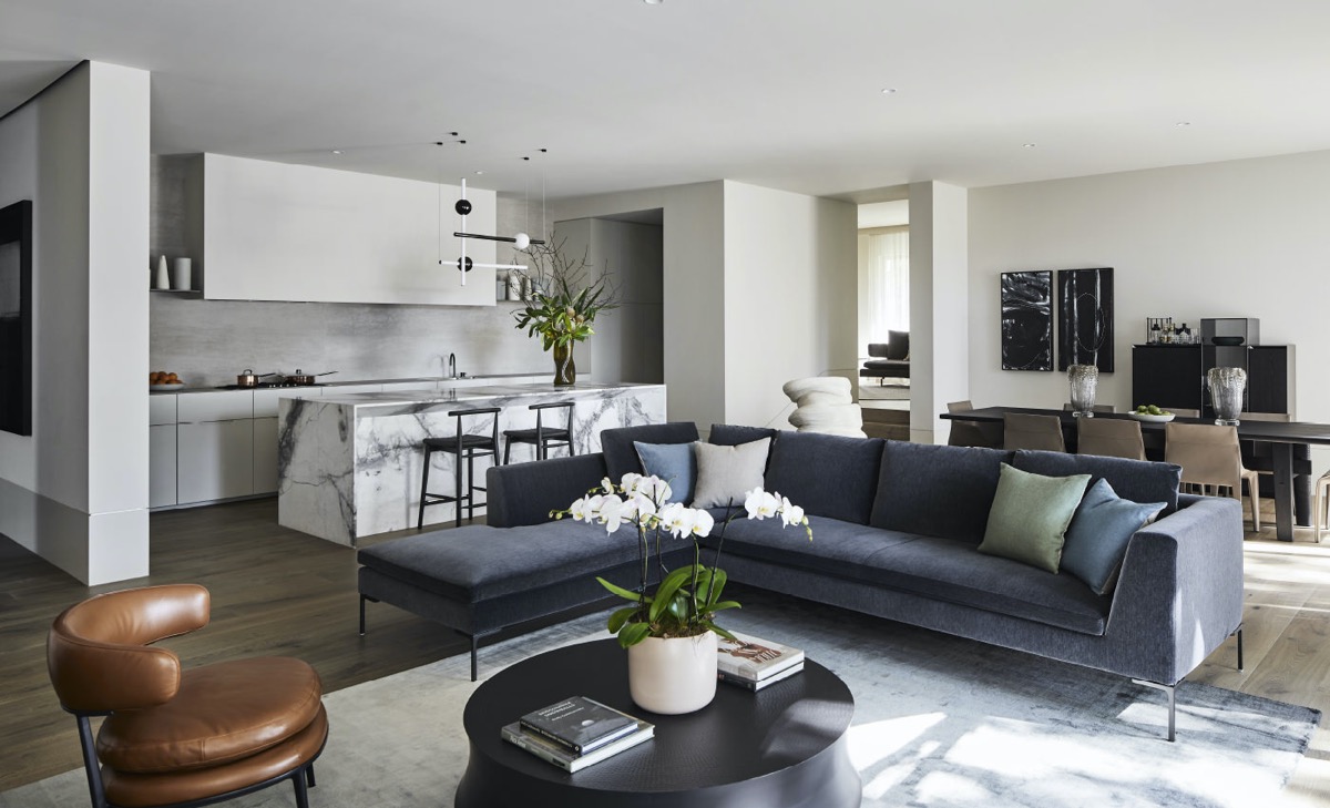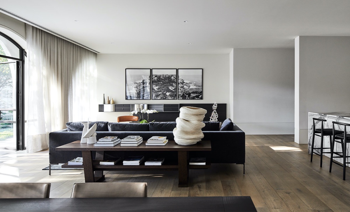 Bên trong biệt thự hiện đại 2 tầng được thiết kế nội thất với những đường cong, tối giản công năng đặc biệt cùng những chi tiết trang trí như bàn café tròn tạo nên sự kết nối không gian.