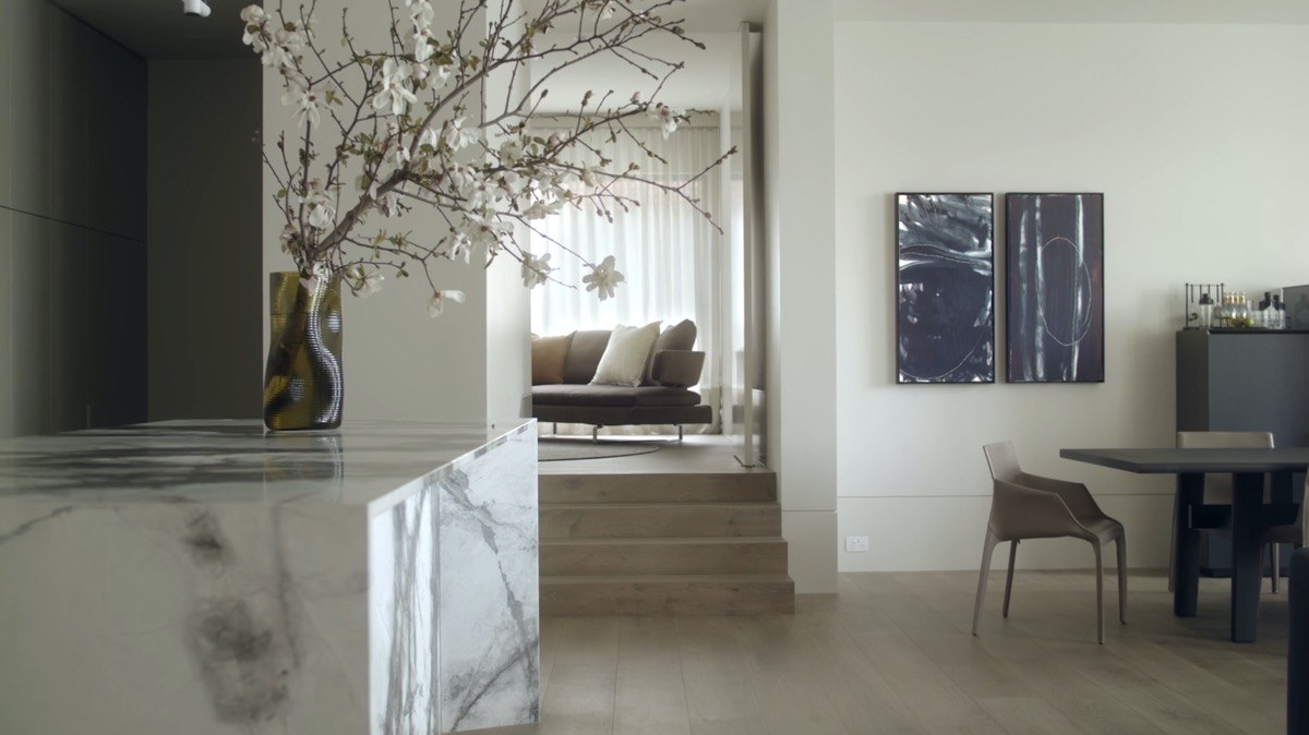 Bàn đảo bếp rộng bằng đá cẩm thạch, bao bọc chắc chắn khối trung tâm ở ba mặt đầy đủ. Tủ bếp màu trắng nhẹ nhàng sang trọng, khu vực bếp được thiết kế vô cùng rộng rãi.