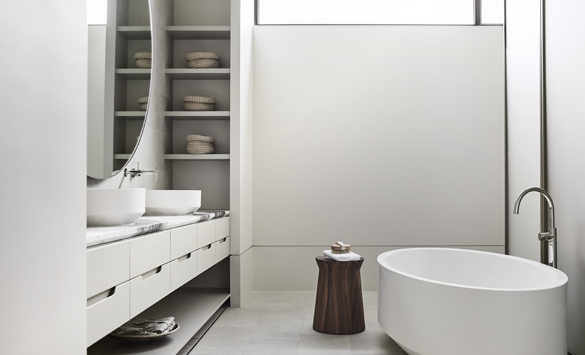Trong phòng tắm, bồn tắm hình bầu dục độc lập mang lại họa tiết tròn trịa của ngôi nhà. Một chiếc bàn mộc mạc hiện đại có thể đựng đồ vệ sinh cá nhân trong tầm tay.