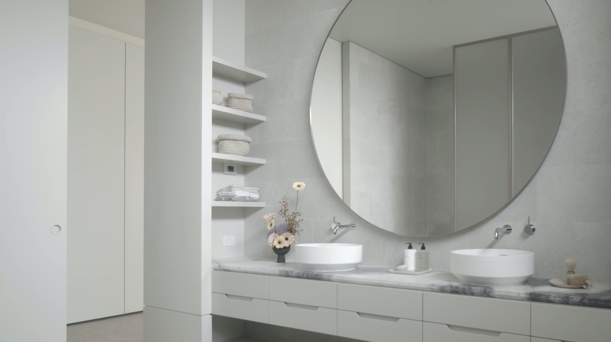 Một chiếc gương tròn khổng lồ tạo những đường cong cho bức tường của phòng tắm màu trắng, nơi nó được đặt ở vị trí trung tâm phía trên bàn trang điểm phòng tắm bồn rửa đôi.