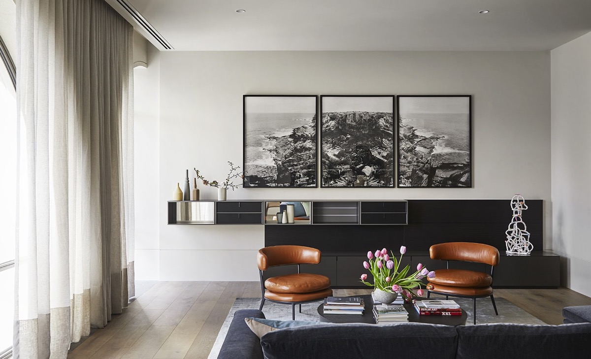 Các nội thất được sắp xếp gọn gàng, gam màu xanh đen, màu cam.. nội thất làm điểm nhấn giúp phòng khách trở nên ấm cúng hơn.