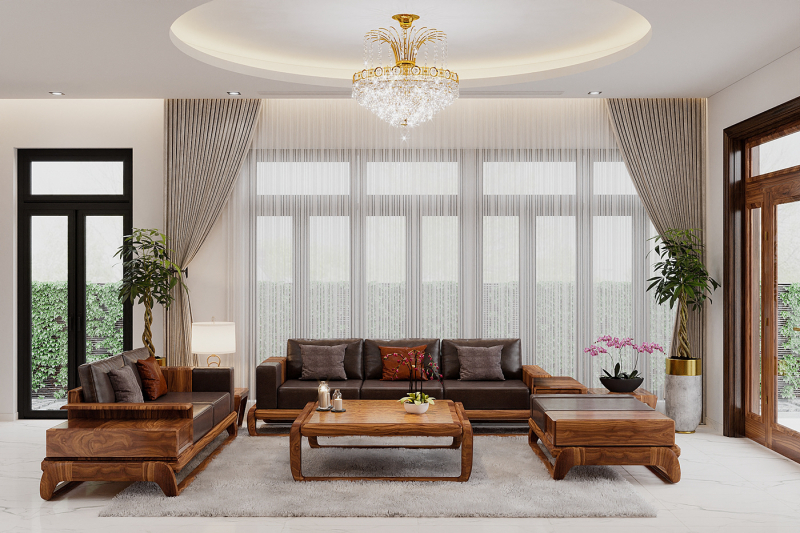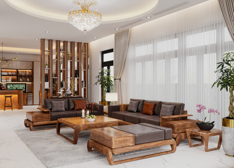 Phòng khách của biệt thự được thiết kế với không gian mở, với cửa sổ lớn cho phép ánh sáng tự nhiên chiếu sáng toàn bộ không gian. Bộ sofa và bàn trà được chế tác từ gỗ óc chó, tạo nên một điểm nhấn ấn tượng.
