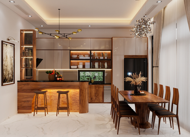 Phòng bếp và nhà ăn cũng không nằm ngoài sự chăm sóc tỉ mỉ. Bàn ăn được làm từ gỗ óc chó tự nhiên, kết hợp với các ghế ăn có đệm bọc nỉ mềm mại. Bộ bàn ăn không chỉ chức năng mà còn là một tác phẩm nghệ thuật trang trí, tôn lên vẻ đẹp tự nhiên của gỗ óc chó.