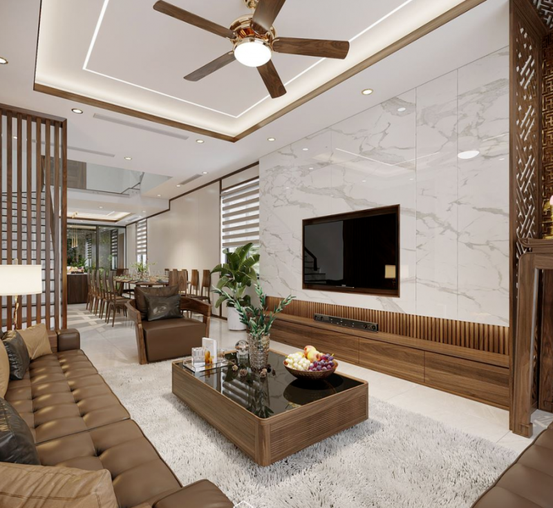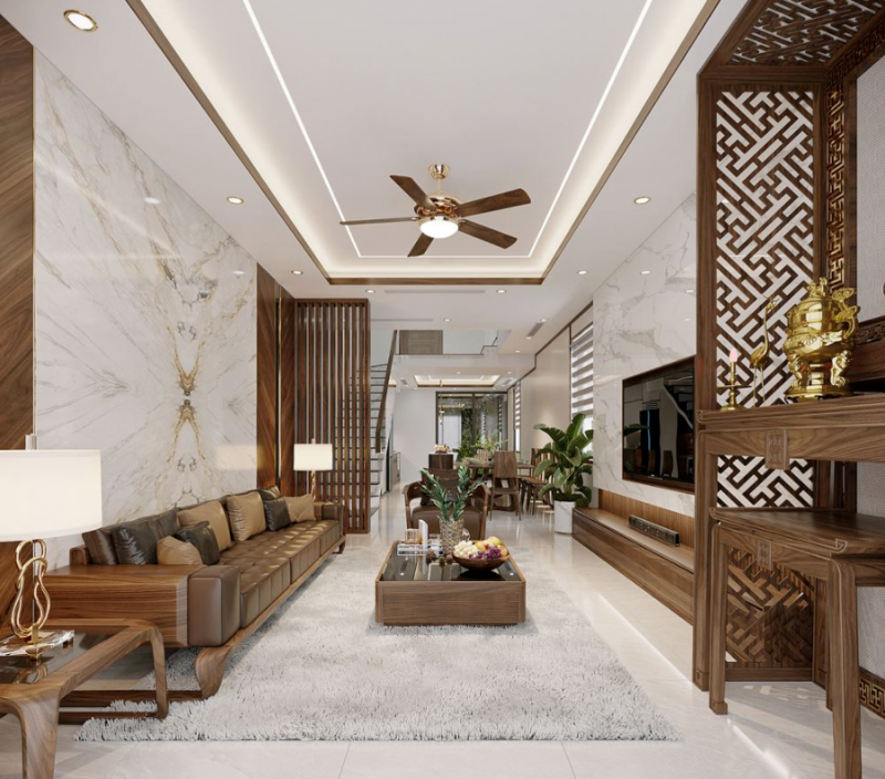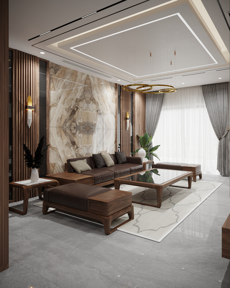 Phòng khách là trung tâm của căn nhà, và thiết kế nhà phố tận dụng gỗ óc chó để tạo nên bộ sofa và bàn trà vô cùng đẳng cấp. Bộ sofa được chế tác tỉ mỉ, với đường nét mềm mại, tạo nên sự thoải mái và sang trọng. Bàn trà là một tác phẩm nghệ thuật riêng, khi chất liệu gỗ óc chó kết hợp với kính.