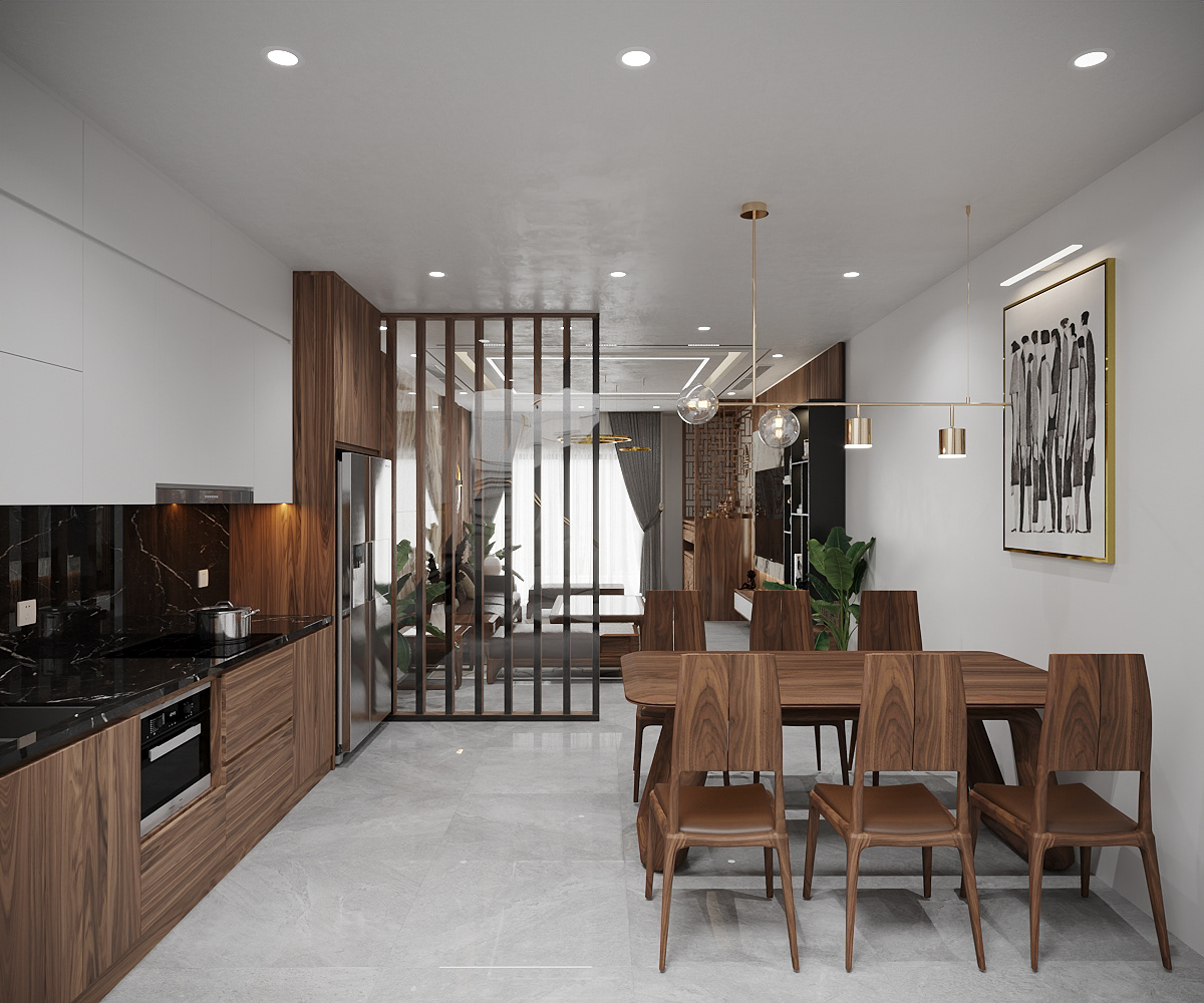 Thiết kế nội thất căn hộ chung cư gỗ óc chó