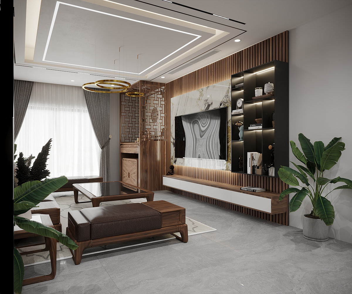 Thiết kế nội thất biệt thự với sự sử dụng chất liệu gỗ óc chó mang đến một không gian sang trọng và tinh tế, kết hợp giữa vẻ đẹp tự nhiên và sự ấm áp của gỗ.