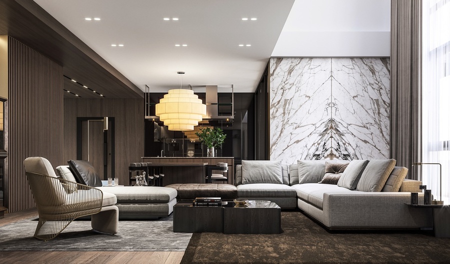 Nếu đang tìm kiếm một điểm nhấn mang đến sang trọng, đẳng cấp cho không gian phòng khách của mình thì đừng bỏ qua những mảng tường ốp đá thiên nhiên nhé. Cách trang trí này phù hợp với nhiều phong cách thiết kế biệt thự hiện nay đặc biệt là phòng khách kiểu Luxury, Tân Cổ điển.